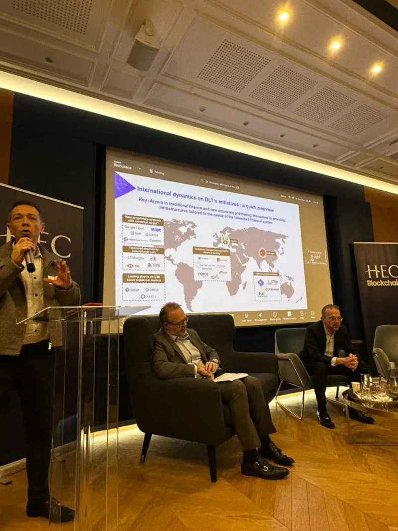 Attended a session at HEC Paris Alumni House featuring Pierre Blanchet (Amundi) on bridging TradFi and DeFi, Daniel Turquety (BNP Paribas) on Europe's digital asset market, and Nicolas Barbaroux (Banque de France) on scaling tokenized finance. Station F startups pitched practical blockchain apps for finance.